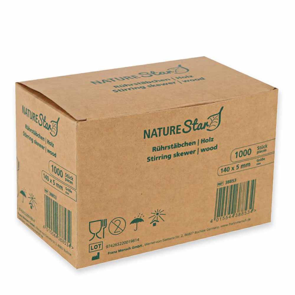 Die Bio Rührstäbchen aus Birkenholz mit einer Länge von 14cm und einer Breite von 5mm sind in einer Verpackungseinheit von 10 x 1000 Stück pro Karton erhältlich.