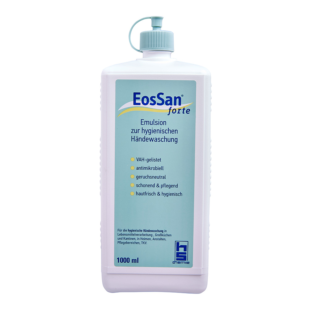 Die EosSan-Emulsion-forte wird in einer praktischen Kunststoffflasche geliefert. Sie ist unparfümiert und enthält 1 Liter des Produkts. Geeignet für professionelle Anwender.